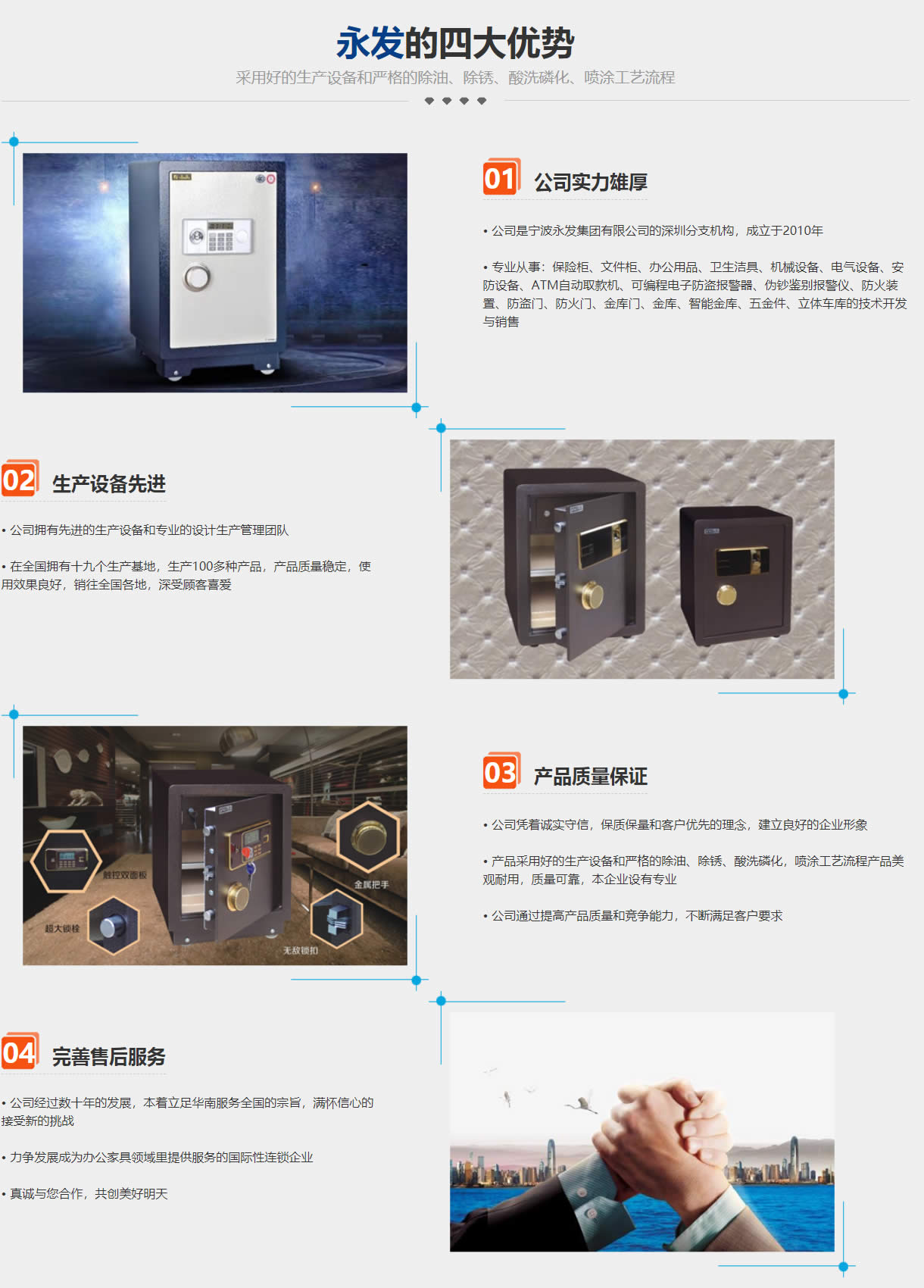 深圳永發(fā)安防產(chǎn)品有限公司 深圳永發(fā)安防產(chǎn)品有限公司,是寧波永發(fā)集團(tuán)有限公司的深圳分支機(jī)構(gòu),成立于2010年,專(zhuān)業(yè)從事:保險(xiǎn)柜、文件柜、辦公用品、衛(wèi)生潔具、機(jī)械設(shè)備、電氣設(shè)備、安防設(shè)備、ATM自動(dòng)取款機(jī)、可編程電子防盜報(bào)警器、偽鈔鑒別報(bào)警儀、防火裝置、防盜門(mén)、防火門(mén)、金庫(kù)門(mén)、金庫(kù)、智能金庫(kù)、五金件、立體車(chē)庫(kù)的技術(shù)開(kāi)發(fā)與銷(xiāo)售。